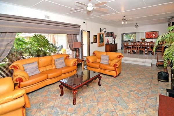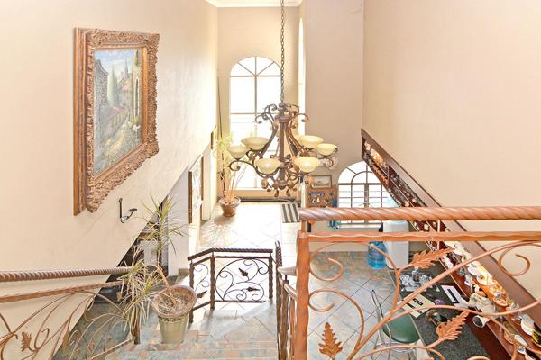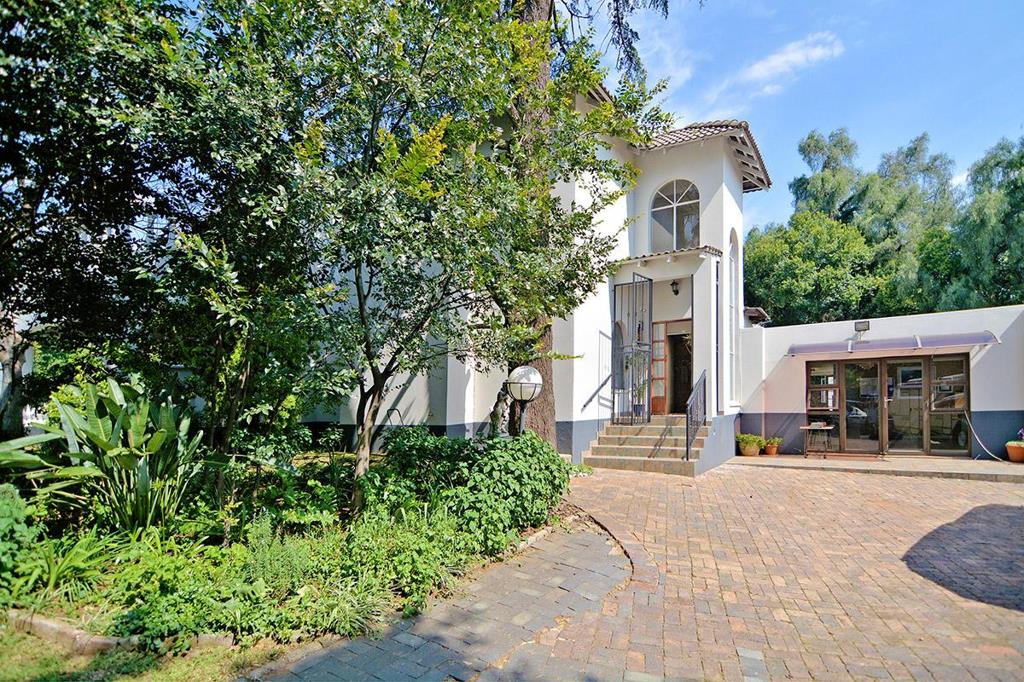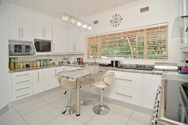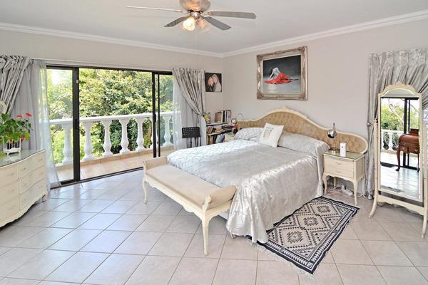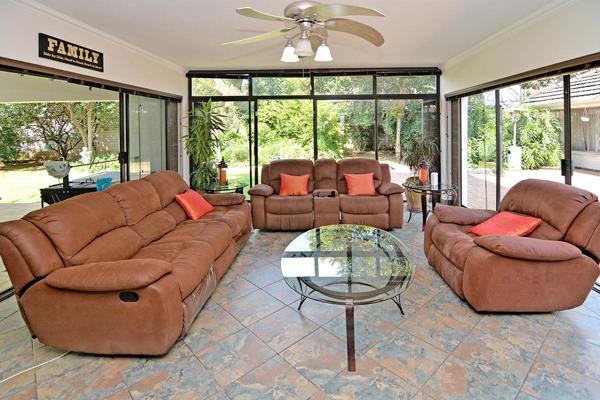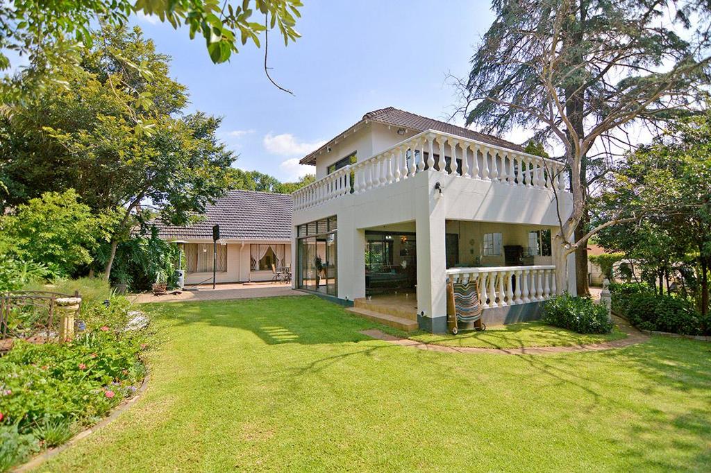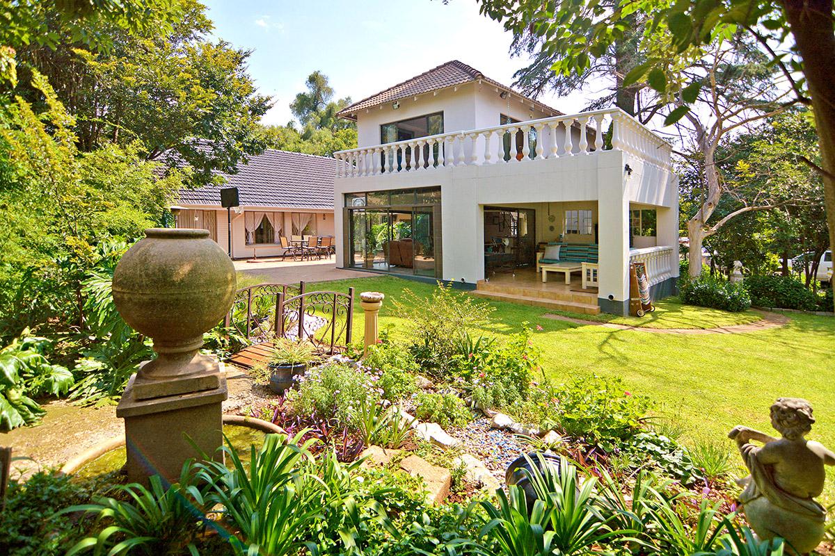 This distinguished post-modern residence beautifully harmonizes with its wooded setting, offering total seclusion. Situated in a highly sort after 24 hr access controlled exclusive suburb. Warm character family home offering super accommodation and entertainers delight with open family room , built in pub area with oven, gas hotplates, fridge., leading onto a covered patio, built-in braai .Open plan kitchen, separate scullery leading onto well proportioned living areas with wood fireplace. 4 beds, 2 bathroom, 1 en suite plus upstairs main bedroom with bathroom, dressing area and private balcony overlooking the tropical garden. Plus a work from home office/self contained cottage. 2 separate staff accommodation each with bathroom. Playground paradise garden with jungle gym. Electric fence, trellidoors and CCTV camera