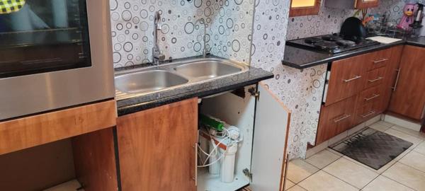 The kitchen is beautifully fitted with sleek granite countertops and plenty of cupboard space, flowing seamlessly into the tiled lounge and dining areas. Step outside to a private garden complete with a Keter outdoor storage cabinet, ideal for organizing garden tools and extras.