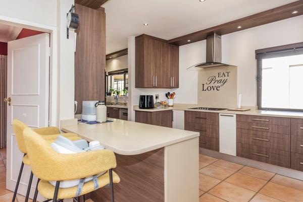 A gourmet kitchen boasts a 5-burner gas stove, Caesarstone countertops, sleek dark cabinetry, complete with a cozy breakfast nook. A separate scullery adds extra convenience for seamless meal prep and clean-up.