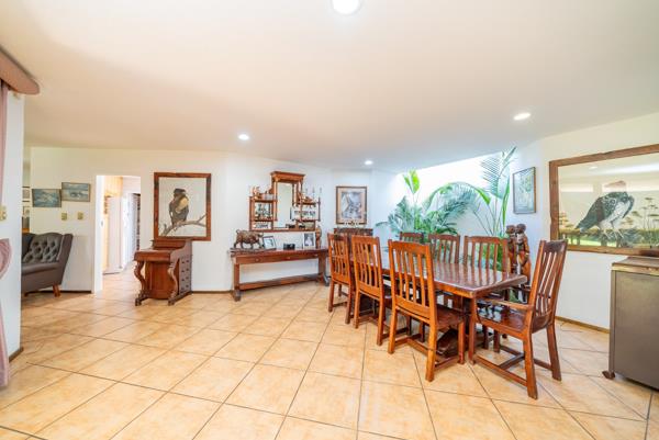 As you enter, you are welcomed by two spacious lounges, each on opposite wings of the home, seamlessly connected by a stylish dining room. Sliding doors lead out to a covered patio, creating a natural flow to the lush garden oasis, ideal for relaxation and entertaining.