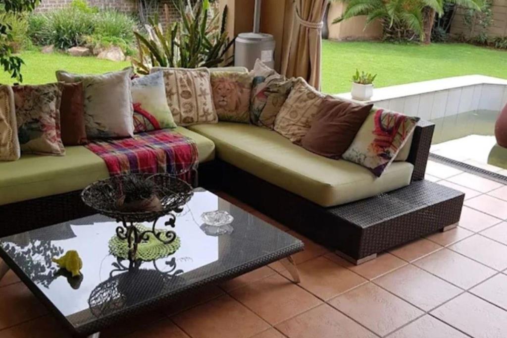 The living area opens onto a relaxing covered patio which overlooks a serene garden, tranquil water feature and captivating garden with mountain view. The outdoor entertainment area has a built-in braai and spacious garden for all your enjoyment and entertainment.