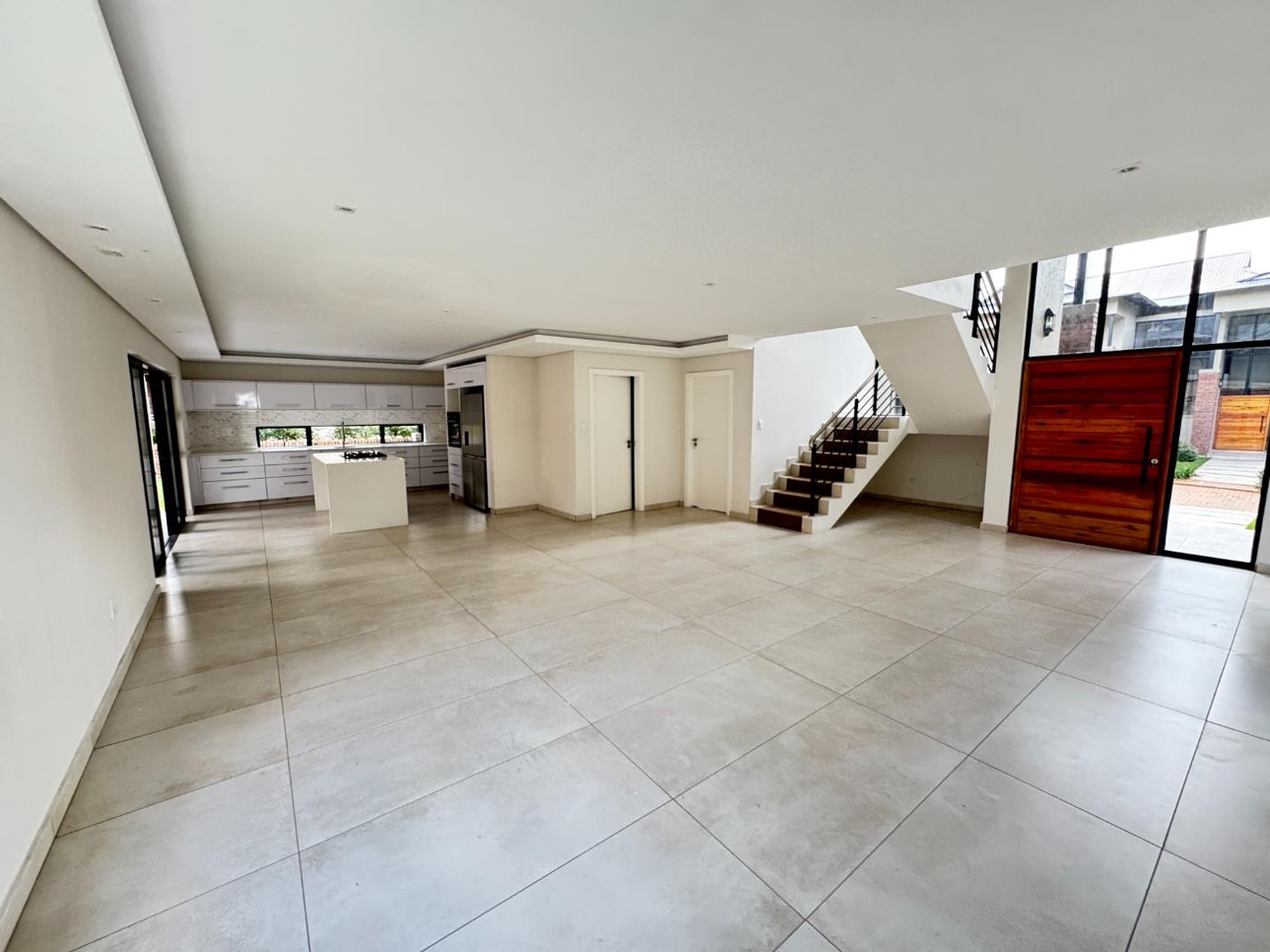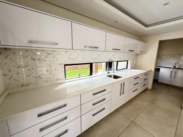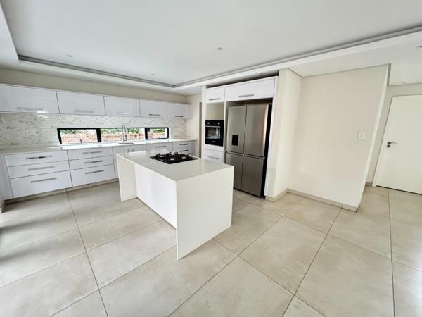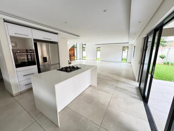 Step inside to discover spacious open-plan living areas designed with both relaxation and entertaining in mind. The lounge and dining spaces flow effortlessly into a sleek, contemporary kitchen finished with Ceasarstone countertops and crisp spatial white cabinetry. High-end appliances, a gas hob, and a separate laundry/scullery complete this gourmet space.
