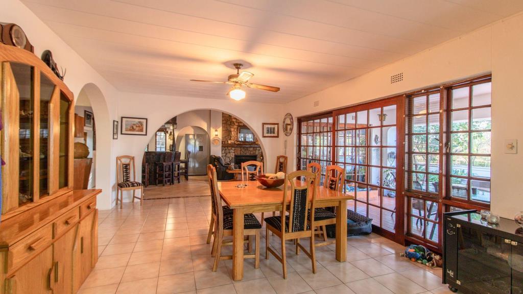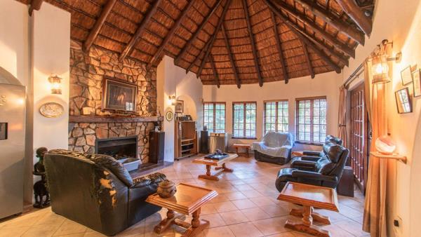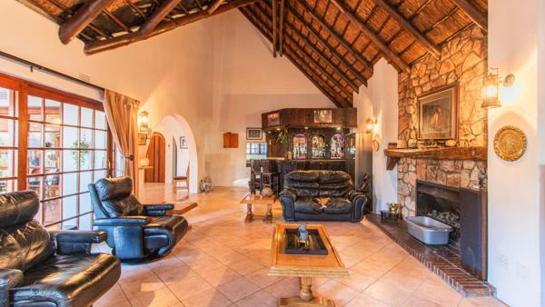 Step inside to soaring thatched ceilings, a grand stone fireplace, and generous open-plan living areas designed for easy flow and comfort. A custom timber bar, expansive lounge, and dining room lead out to a covered patio overlooking the manicured garden and sparkling poolideal for relaxed outdoor living.