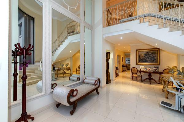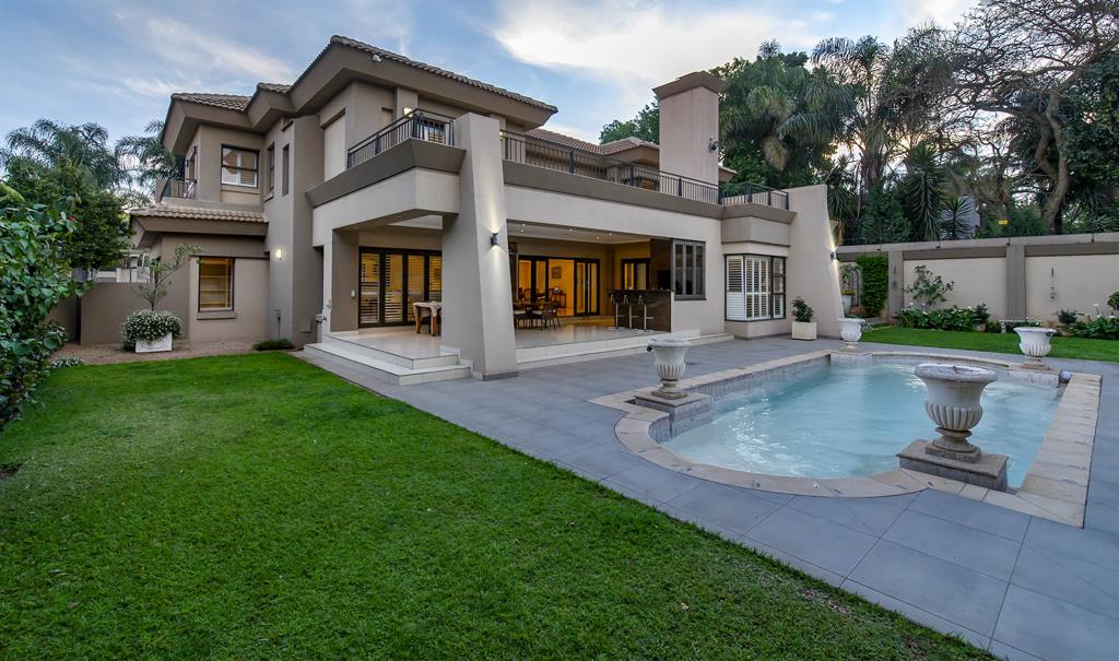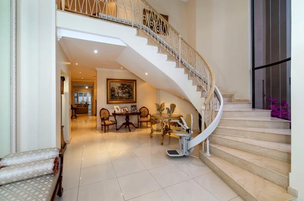 Step into a grand double-volume entrance hall with floor-to-ceiling windows, a striking mirror feature, and a sweeping travertine marble staircase with bespoke balustrading. The home boasts three reception rooms that flow seamlessly onto a covered entertainment patio with built-in bar and braai, overlooking the sparkling pool and manicured irrigated garden. The gourmet eat-in kitchen is fitted with a centre island, granite countertops, two eye-level ovens, integrated microwave and coffee machine, as well as a gaselectric hob, and opens onto a private garden terrace. A study and guest toilet complete the ground floor.