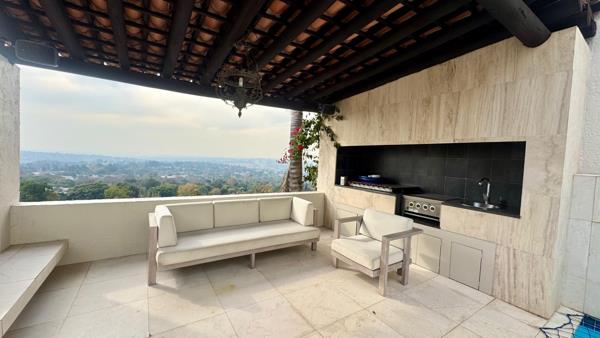 The first floor reveals an expansive lounge complete with a bespoke fitted bar, perfect for sophisticated entertaining. Glass sliding doors open out to a stylish sundrenched terrace and a covered patio with a built-in braai, private swimming pool, and plenty of space for year-round alfresco dining.