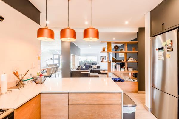 The sleek open-plan kitchen includes a breakfast nook, gas hob with extractor, and ample cupboard space perfect for easy everyday living and entertaining.