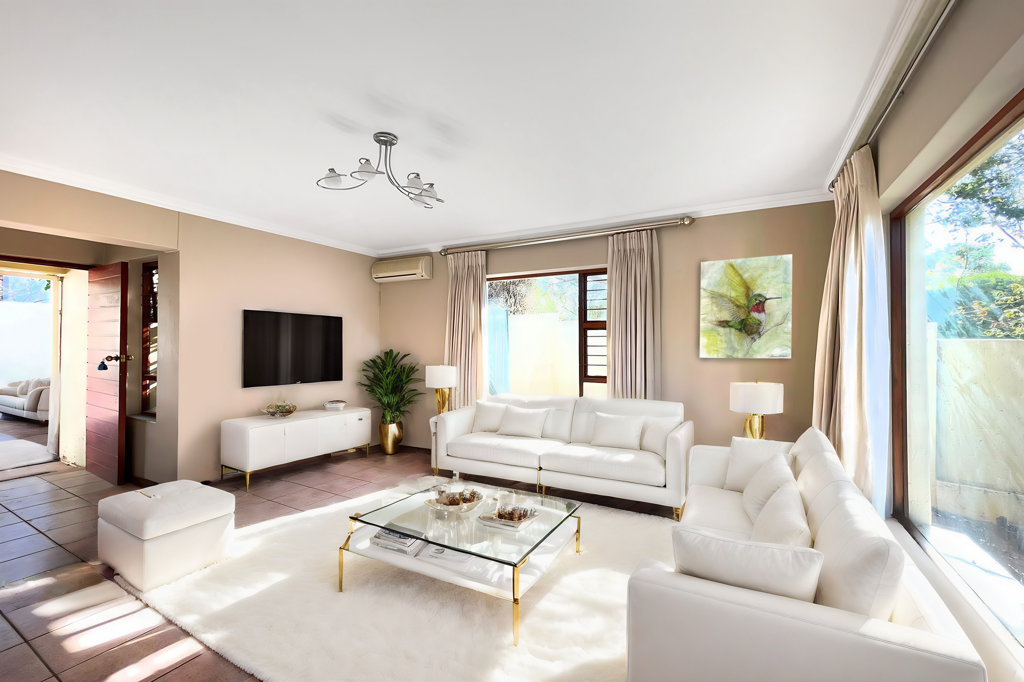 3 Bedroom home with open plan living room areas that lead out onto a patio with wrap around garden.