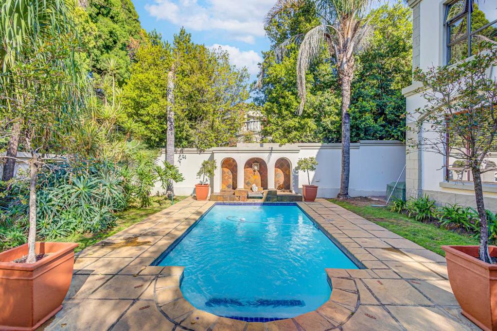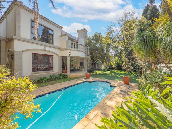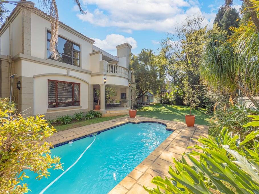 manicured lawns surround a sparkling pool with a thermal cover, while a