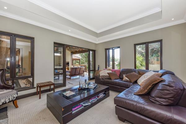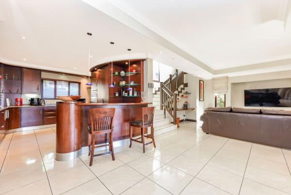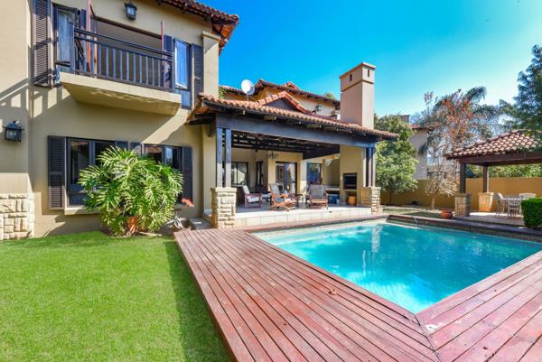 SPACIOUS FAMILY RETREAT. Step into this great home featuring a grand double-volume entrance that sets the tone for elegance and warmth. The spacious design includes 3 inviting reception rooms, all centered around a double-sided fireplace that adds a cozy ambiance for family gatherings and entertaining. At the heart of the home, the granite kitchen boasts a gas hob and a separate scullery opening onto large courtyard space. For added flexibility, a guest suite or work-from-home space is conveniently located downstairs, perfect for accommodating visitors or creating a productive workspace. Discover the underground cellar, a unique space where you can unwind with drinks, listen to music or watch the game with friends in a relaxed atmosphere. The home features 2 spacious living areas that flow seamlessly onto a covered patio, overlooking sparkling pool and beautifully landscaped garden. The separate lapa is perfect for entertaining and enjoying outdoor gatherings.