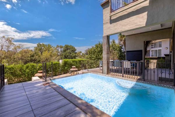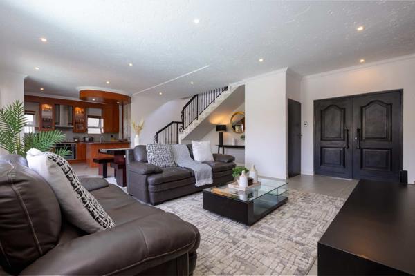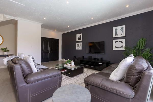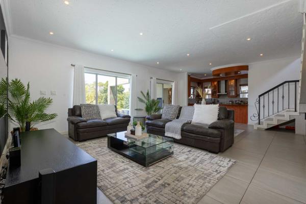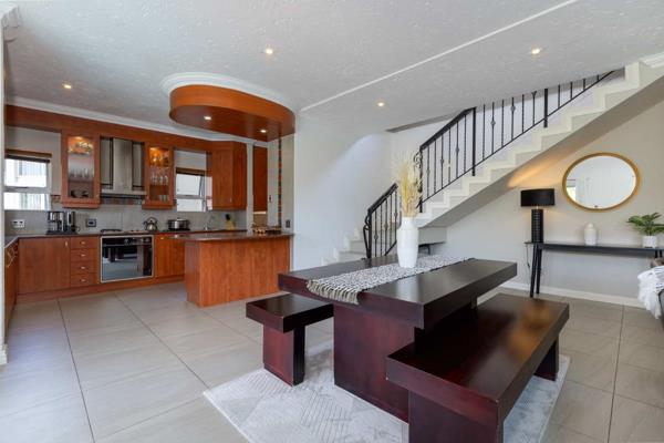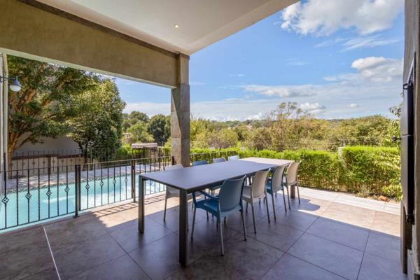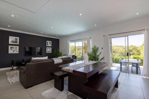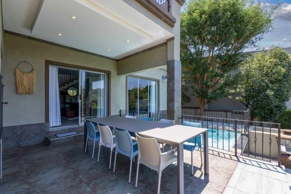A warm and inviting entrance flows onto an open plan family lounge and dining area, seamlessly connecting to an open plan kitchen boasting granite countertops, a breakfast bar, electric and gas hob with oven and extractor fan, prep bowl, plumbed double door fridge space, separate scullery with under counter space for your appliances, plus ample built-in cupboards and display cabinets. A stunning covered patio with a built-in braai is elevated and overlooks the infinity swimming pool and manicured wrap around garden an ideal space to entertain all year round. The guest cloakroom is neatly tucked away and completes the downstairs floor plan.