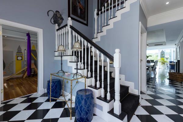 A grand home with flow being a key element, boasts soaring ceilings, gleaming chandeliers and elegant finishes. A magnificent entrance hall lures you to a formal lounge with a feature split wood burning fireplace. This spills onto an entertainers patio offering the utmost privacy and a picturesque view of the sparkling blue heated swimming pool / jacuzzi and pristine garden. State of the art open plan kitchen with Caesarstone counter tops, a centre-island, breakfast bar, La Conche gas hob and oven with matching extractor fan, prep bowl, integrated fridge/freezer, built in ice maker, separate scullery area with under counter space that can accommodate all your appliances, plus ample built-in cupboards. The dining area is adjacent to the kitchen and offers a classy fitted cocktail bar, ideal when entertaining family, friends and business associates. The floor plan is complete with his and hers work from home space.