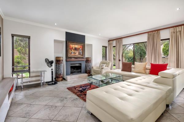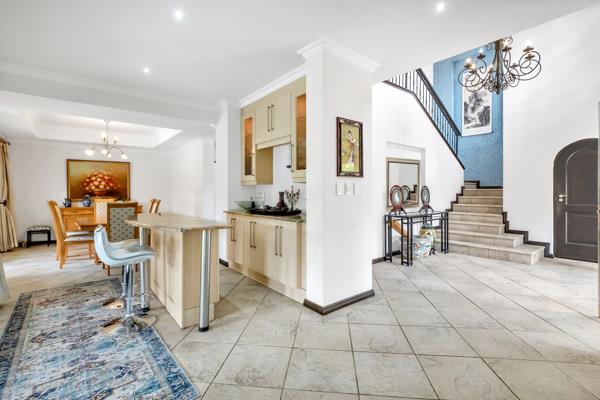 The main level features a harmonious blend of open-plan living and entertainment spaces. At the heart of the home is a fully stocked bar area leading to a cozy lounge complete with a fireplace. A spacious dining room flows effortlessly onto a generous patio, equipped with a built-in braai, where you can enjoy picturesque views of the landscaped garden and sparkling swimming pool.