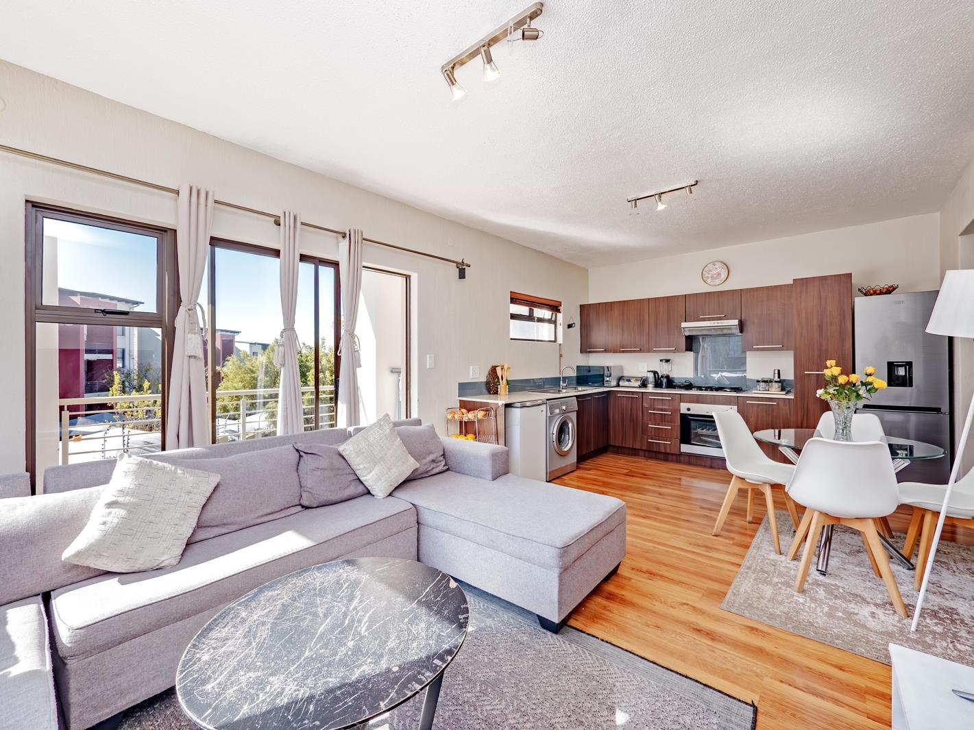 Sun streams into the living room area with laminated flooring. It leads onto a balcony.