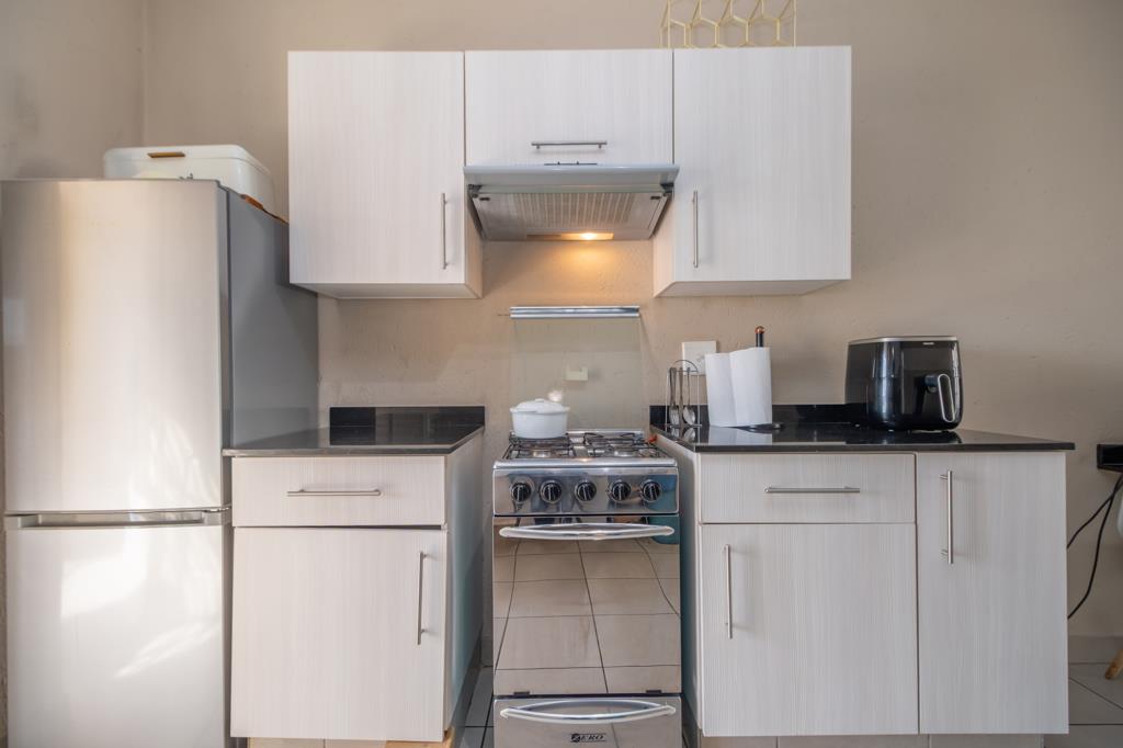 The modern kitchen includes granite countertops, a built-in oven with a 4-plate stove and extractor fan, plus space for an under-counter appliance.