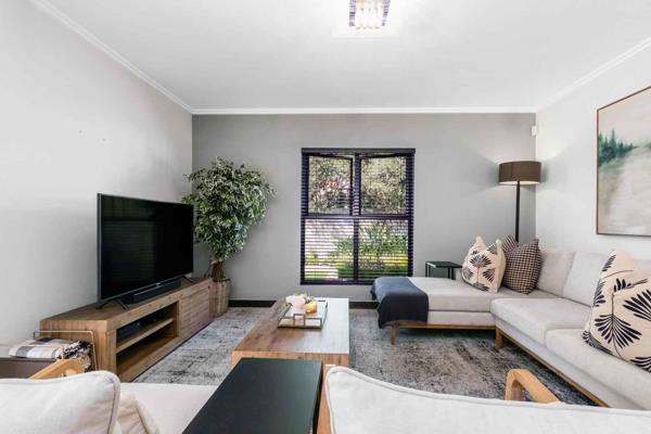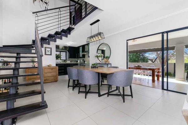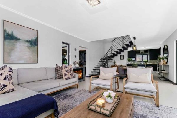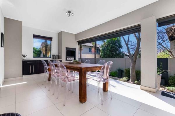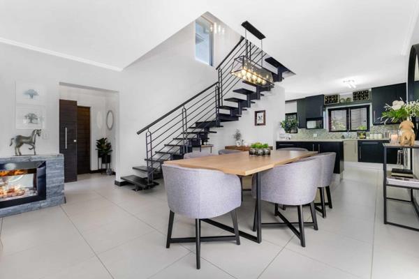 Inviting entrance hall flows effortlessly onto the spacious light and bright open plan lounge and dining area with feature gas fireplace, spilling out onto a covered patio with built-in gas braai, overlooking the manicured garden. Awe-inspiring kitchen with Caesarstone counter tops, gas hob plus extractor fan, separate scullery with under counter space for 2 appliances, double door fridge space plus ample soft touch cupboards.
