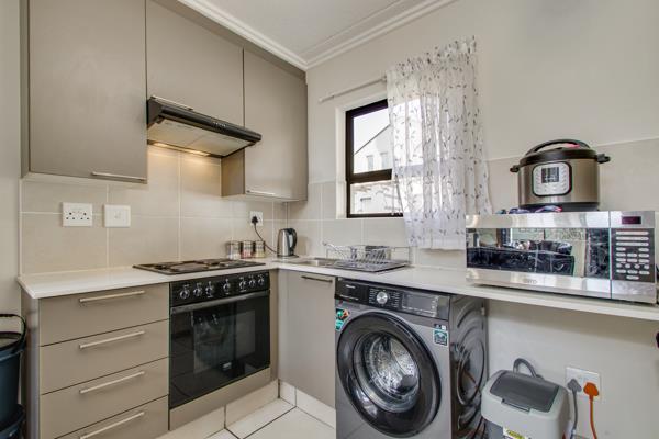 It features an open- plan kitchen with modern grey and white finishes, with space for appliances and a single fridge, along with an electric stove and oven. The kitchen opens up to a spacious living area with sliding doors that lead to a balcony perfect for relaxing. The bedroom is generous in size, equipped with built-in cupboards, and the full bathroom includes both a bath and shower.