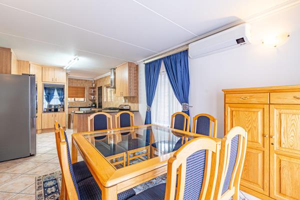 The home opens to a warm entrance hall leading into generous open-plan living and dining spaces, complete with Samsung inversion air-conditioning and a charming fireplace. Natural light fills the interiors, complemented by Wi-Fi-enabled touch lighting, fibre connectivity, and a 5-stage filtered water system. The modern kitchen features soft-close cabinetry, a newly installed gas hob (Nov 2025), electric oven, pantry, and a spacious scullery with room for three appliances as well as a garbage disposal. The living areas flow seamlessly onto a covered patio and an additional braai terrace, overlooking a peaceful garden with a koi pond and a saltwater chlorinated pool.