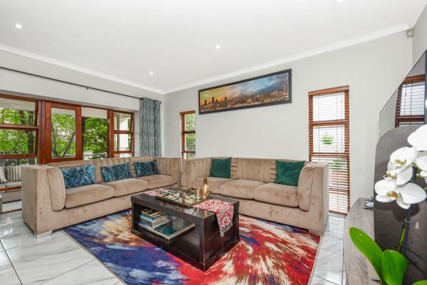 The heart of this home is the gourmet granite kitchen, complete with ample storage, a premium Smeg gas stove, and space for a double-door fridge. The kitchen also includes a built-in wine rack. A separate scullery offers additional practicality, fitting 2 wet appliances and providing direct access to the garden. The adjoining spacious dining room opens out to a well-maintained garden, featuring a sparkling pool great for relaxing on sunny days.