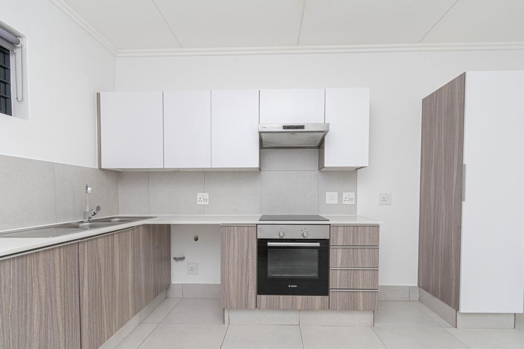 The kitchen features elegant finishes, with space allocated for two under counter appliances, a single door fridge, spot for the microwave and a double sink alongside an electric stove and oven. It seamlessly flows into the expansive living area, which is large enough to accommodate both a dining and lounge setup. Sliding doors open onto a covered patio, leading to a generous garden space, perfect for enjoying the outdoors.