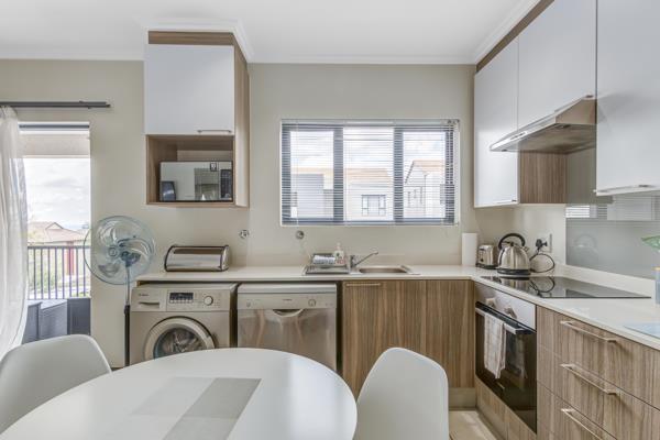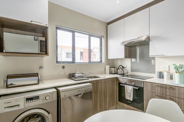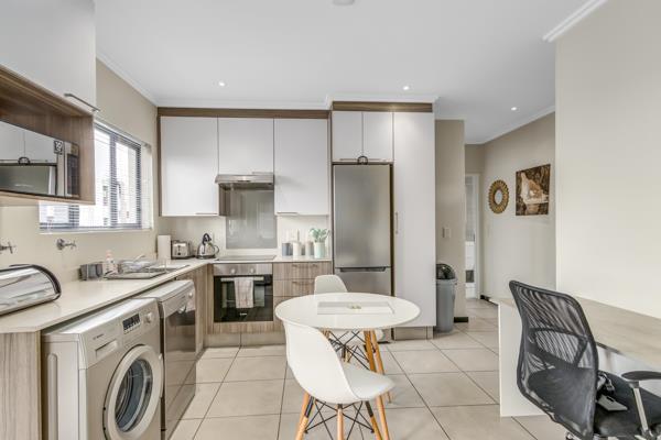 The modern kitchen is both sleek and practical, featuring clean-lined cabinetry, stone-look countertops, and high-quality appliances. It includes space for a washing machine and fridge, with ample storage and a functional layout perfectly suited to everyday living. A cosy dining nook adds charm and convenience for meals or work-from-home use.