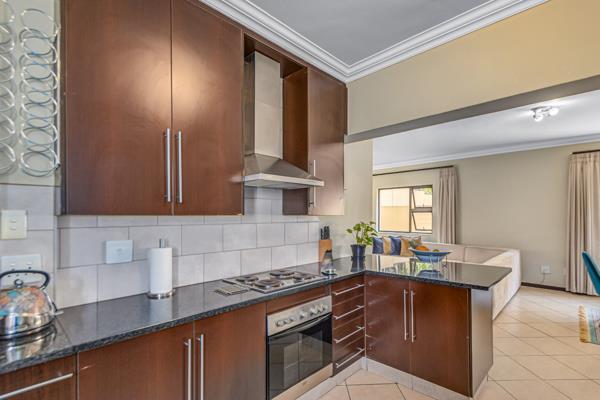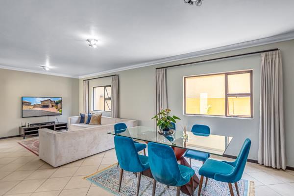 Downstairs welcomes you with a bright, open-plan design where the kitchen, dining, and living areas flow seamlessly together. Large windows invite natural light to fill the space, while the living room opens to a covered patio with a built-in braai, perfect for relaxed gatherings and summer evenings. The patio overlooks a wrap-around garden, offering extra outdoor space for entertaining or enjoying quiet moments. The kitchen provides ample cupboard space and room for two under-counter appliances, while a convenient guest toilet completes the ground floor.