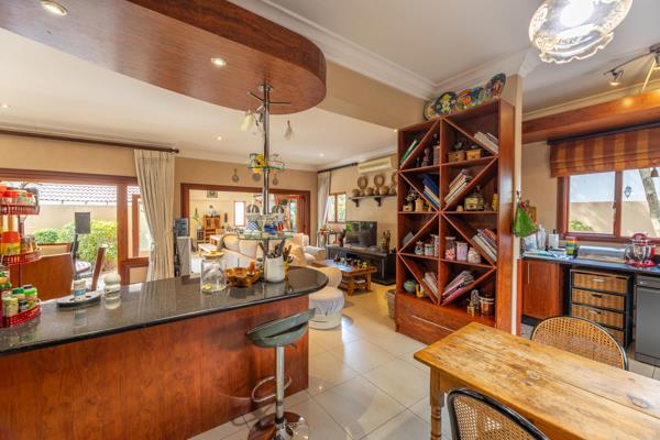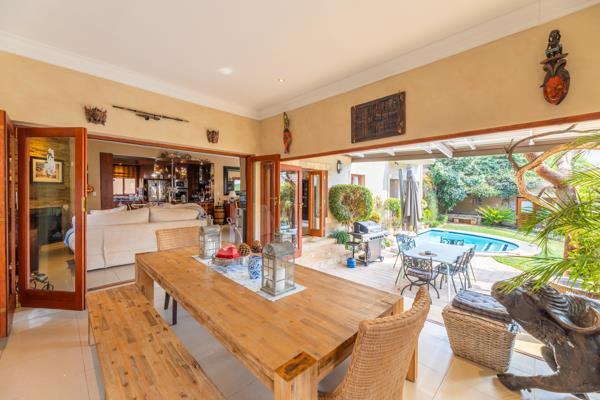 Outdoors, the pool glitters for year-round use while the sprinkler system keeps the low-maintenance planting lush and effortless. The patio reads like a second living roomshaded, spacious, and designed for long dinners beneath the starsperfect for everything from casual braais to intimate dinner parties. The flow of spaces has been considered for living as much as for showing, so guests naturally drift from conversation to cocktails to the pool without interrupting the houses easy rhythm.