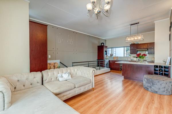 This sophisticated two-bedroom, two-bathroom residence, spanning 101.00 sqm, is situated within a secure estate in Broadacres, Sandton. The interior boasts an exemplary open-plan design, seamlessly integrating the kitchen, dining, and lounge areas. Modern wood-look flooring extends throughout, complemented by abundant natural light streaming through expansive sliding glass doors that provide access to a private balcony. The contemporary kitchen features rich cherry-wood toned cabinetry, generous countertop space, and a central island with an integrated wine rack, ideal for both culinary pursuits and entertaining. The living area is further enhanced by a stylish faux brick accent wall, adding a distinctive character to the space.