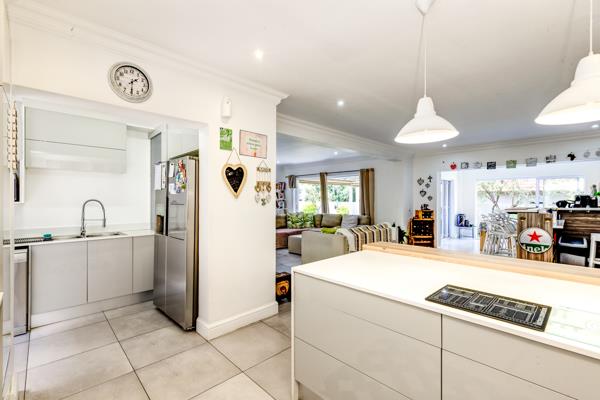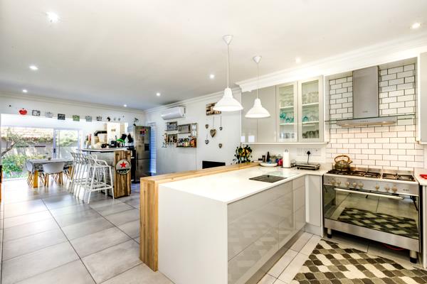 The expansive, open-plan living space is bathed in an abundance of natural light, creating an inviting atmosphere. The layout encompasses a spacious lounge, dining room, as well as a built-in braai and pizza ovenideal for hosting unforgettable gatherings. At the heart of this home lies a newly renovated, modern kitchen that is as functional as it is impressive. Featuring exquisite Caesarstone countertops, the kitchen is equipped with a high-end gas hob, electric oven, and sleek cabinetry that offers a high gloss and soft-touch finish with abundant storage space. A convenient prep sink, ample room for a double-door fridge, and a chic breakfast bar complete this culinary haven. The adjoining scullery ensures additional storage and space for all your kitchen essentials, blending practicality with style.