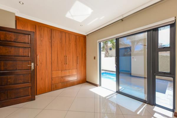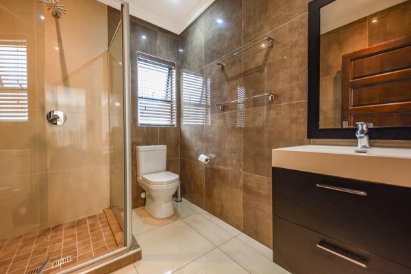 Downstairs there is a guest suite with a stylish bathroom. The main lounge has a feature gas fireplace. Fabulous open plan Caesar stone kitchen with gas hob, breakfast bar, space for a double door fridge, prep sink, ample cupboard space and a separate scullery with space for 3 appliances. Upstairs takes you to a spacious pyjama lounge that leads to a sunny balcony, three generous air conditioned bedrooms and two full modern bathrooms. The main bedroom has a super Hollywood walk-in dressing room and a full ensuite bathroom with double vanity.