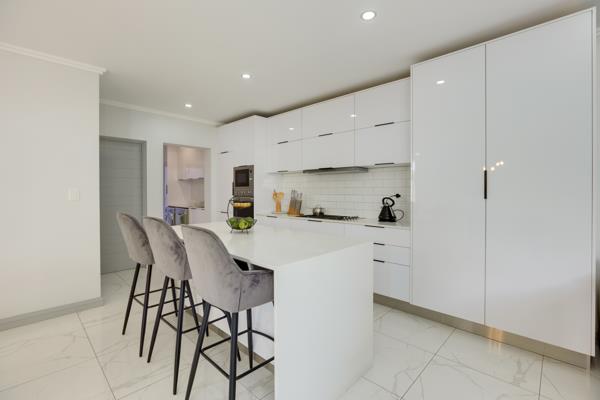 Gourmet Kitchen: This well-appointed kitchen features an integrated fridge, a spacious center island, and a 5-burner gas stove. Ample cupboard space, including spice racks, and elegant Caesarstone countertops make this a chefs delight.