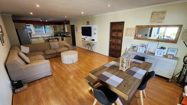 This stunning single-story free-standing property, within a sought-after estate, welcomes you into a large open-plan living area boasting laminate flooring. An open-plan contemporary kitchen features a centre island boasting wine-racks and a prep basin, as well as ample cupboard space, and granite counter-tops. This adjoins the spacious dining room and lounge which opens out through glass sliding doors onto a covered patio area. The patio overlooks a private sizeable wrap-around garden and entertainment area with built-in braai.