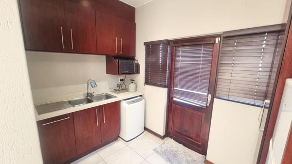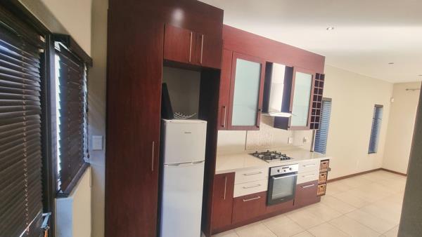 An open-plan lounge and dining area seamlessly connects to a thoughtfully designed kitchen, complete with ample cupboard space, a gas stove paired with an electric oven, and a stainless steel extractor fan. There is designated space for a fridge and an under-counter appliance. The dining area opens onto a covered patio through a sliding door, which includes a built-in braai, perfect for entertaining. Additionally, you''ll find a garden on the side, a guest toilet with a built-in cupboard, and a double garage that accommodates two vehicles.
