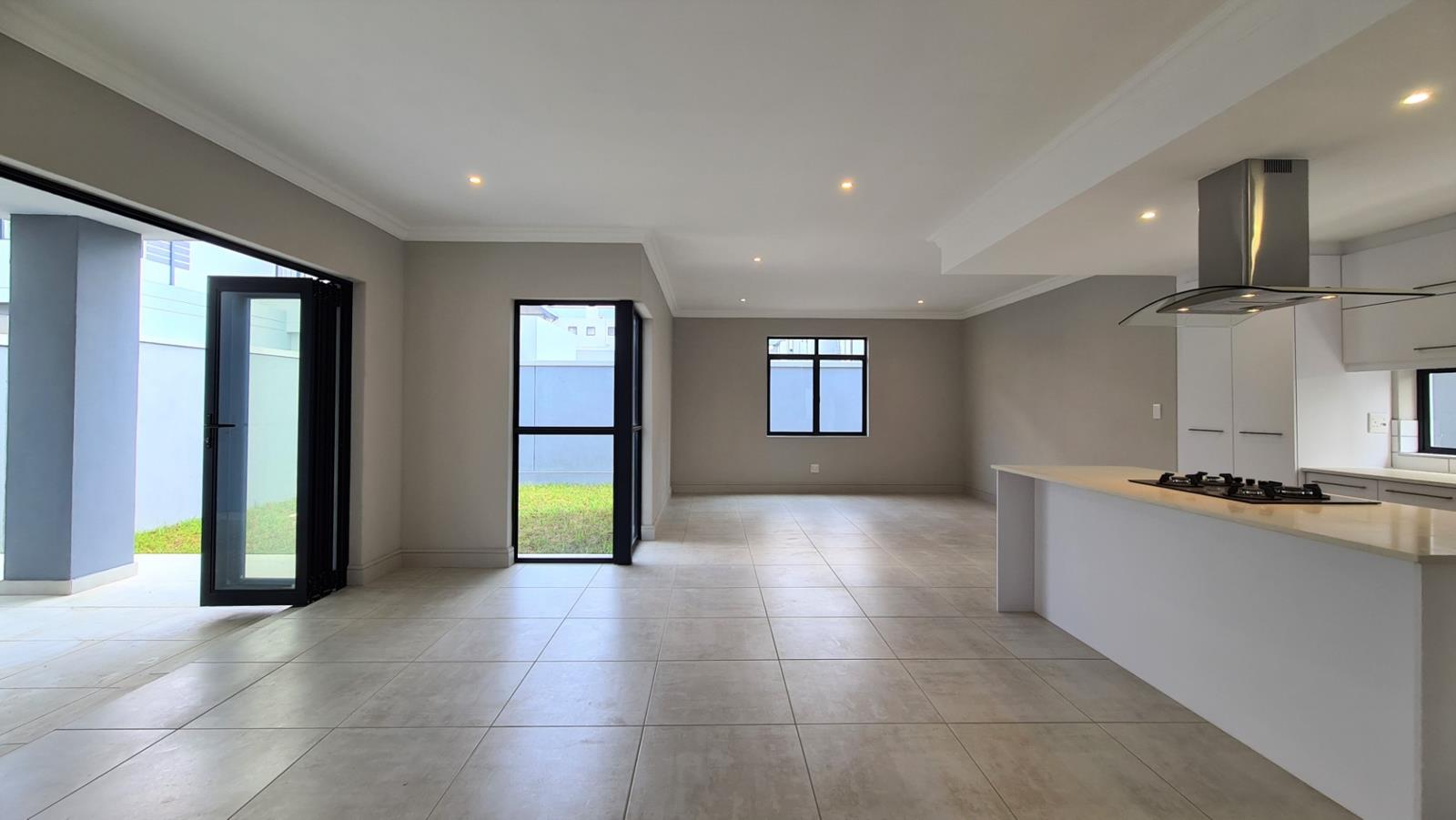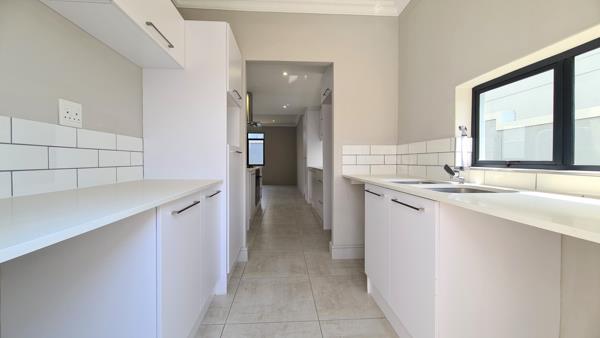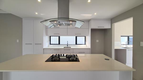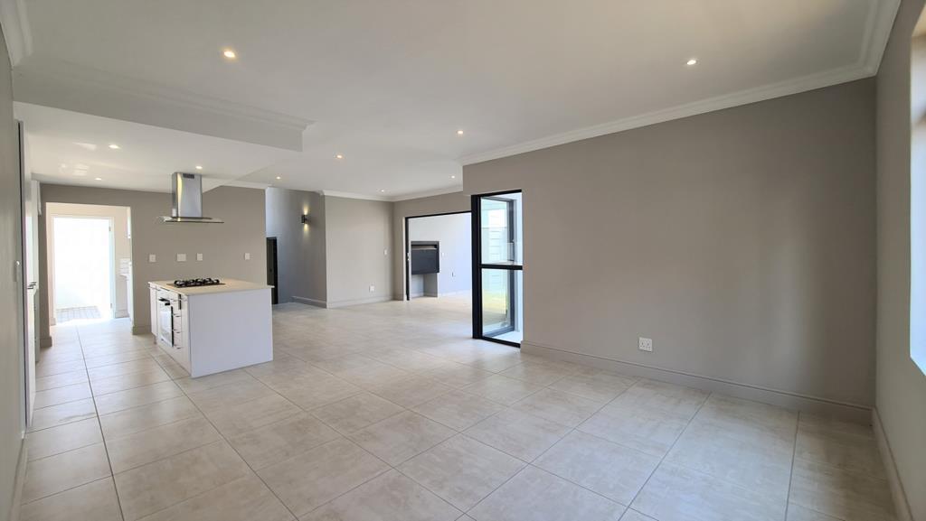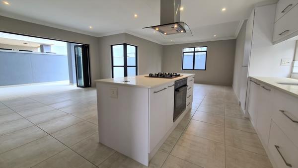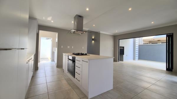 Offering comfortable practical living at its best, with pristine upmarket finishes, sleek modern tiling, and brilliant natural lighting throughout. The lounge/living room is sizeable and adjoins the dining room and kitchen. The modern open-plan chefs kitchen offers ample cupboards, Caesarstone countertops, a prep basin, designer centre-island which houses a gas hob with overhead extractor, an under-counter oven, as well as space for a double fridge. The separate scullery offers space for 3 under-counter appliances, and leads to a courtyard. The open-plan dining room opens out through glass stacking doors to a covered patio with built-in braai, overlooking the garden. Completing the ground floor is a guest loo and a sizeable double garage interleading directly into the home.