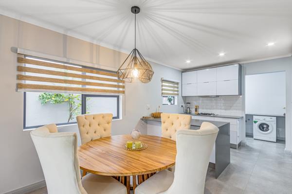 Downstairs welcomes you with a spacious open-plan living area, ideal for both relaxing and entertaining. The expansive dining area flows seamlessly into a sleek kitchen boasting white gloss cabinetry, integrated SMEG appliances, gas stove and a generous scullery perfect for keeping things tidy behind the scenes. A guest loo adds convenience for visitors. Step outside from the dining area and you''ll find an entertainers dream: a covered patio overlooking a lush, grassed garden a serene setting for weekend braais or al fresco family dinners. Upstairs, the home continues to impress with two generously sized bedrooms bathed in natural light. The main bedroom features an en-suite bathroom and ample closet space, offering a private retreat after a long day. The other two bedrooms are well-sized, with one full bathroom with a tub perfect for families or shared living.