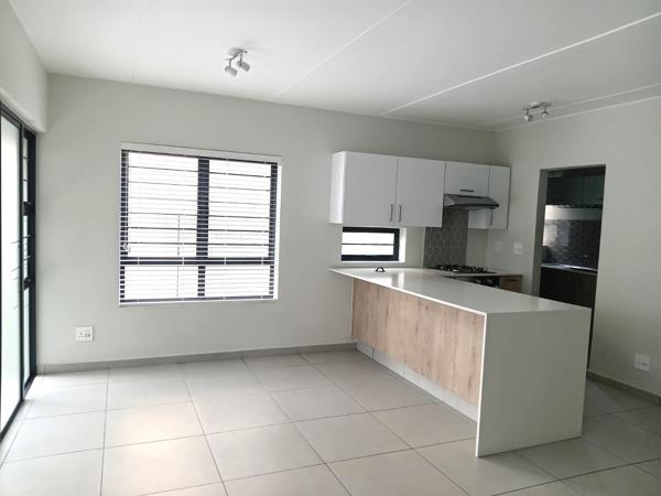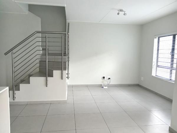 Downstairs through the entrance is an open plan TV/ Family room and a modern kitchenette that boasts a gas stove, ample cupboard space and separate scullery with space for a microwave, 2 wet appliances and a double door fridge. For convenience, a guest toilet is around the corner from the living areas by the main entrance.A sliding door opens out into a neat patio with a built-in braai that overlooks the private garden. Another door opens into an automated double garage. Matching blinds adorn the windows.