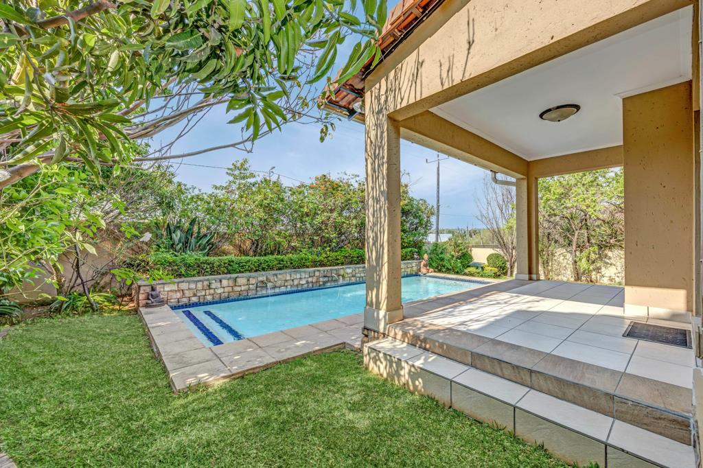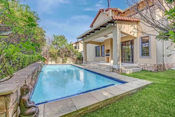 Urgent Seller! Situated in a secure, tree-lined estate, this elegant double-storey lock-up-and-go home welcomes you with a charming entrance that flows into an open-plan lounge and dining area, complete with a cozy wood-burning fireplace. The living spaces open onto a covered patio overlooking a sparkling swimming pool and a lush garden filled with fruit trees.