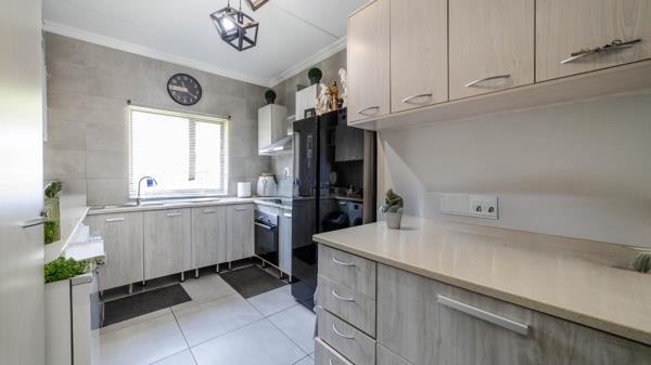 The fitted kitchen boasts Caesarstone countertops, a breakfast bar, ample cupboard space, room for a double-door fridge, and space for two under-counter appliances.