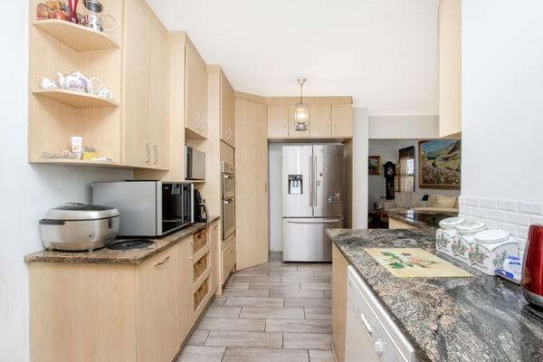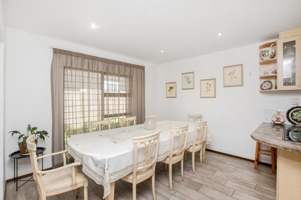 Set on a manageable 366m2 stand in the heart of the estate, this elegant home offers expansive reception rooms to delight the entertainer. Step through the heavy swivel front door, past the feature staircase and enter the huge, open plan, double volume lounge with its impressive pendant light fitting. Leading from the formal lounge is a cosy braai room opening onto the family/TV room and cloistered, open patio area.
