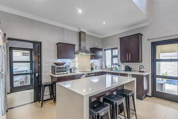 At the heart of the home is a gourmet kitchen designed to impress, complete with Caesarstone countertops, a central island, a dedicated coffee station, prep sink, and separate scullery. This space combines functionality and elegance, making it a true chefs delight.