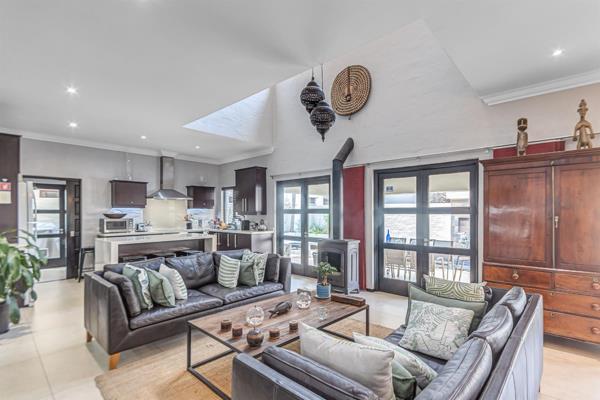 Stacking glass doors open onto a covered patio that overlooks a solar-heated swimming pool and beautifully landscaped, low-maintenance garden filled with striking succulents an inviting haven for year-round entertaining and relaxation.