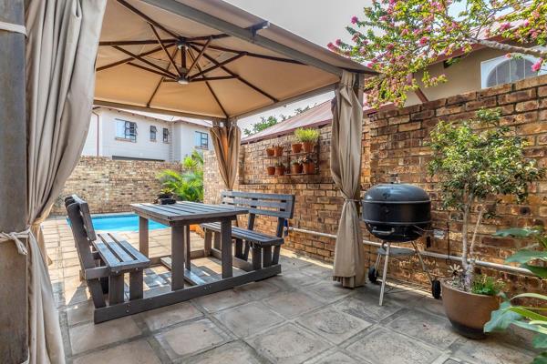 Seamless flow to an enclosed patio with built-in braai and sliding doors opening to the garden