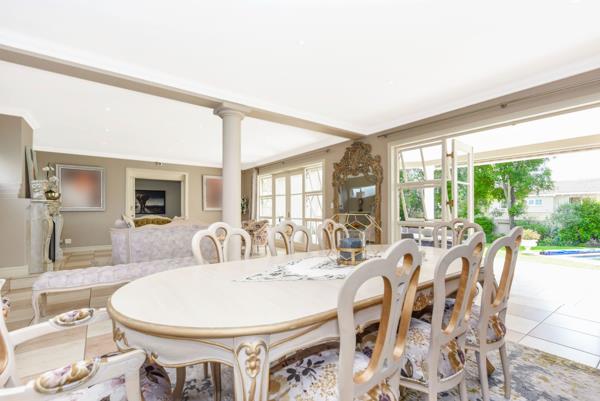 A Home Distinguished By Refinement And Style. This stunning family home has incomparable structure and flow from the entrance throughout. Be greeted by an inviting entrance with paving stones and a water feature. The spacious entrance hall flows to light and bright open plan air-conditioned receptions with feature wood burning fireplace that open onto a large covered entertainers patio with built-in braai, established lush garden with fire-pit and a sparkling swimming pool.
