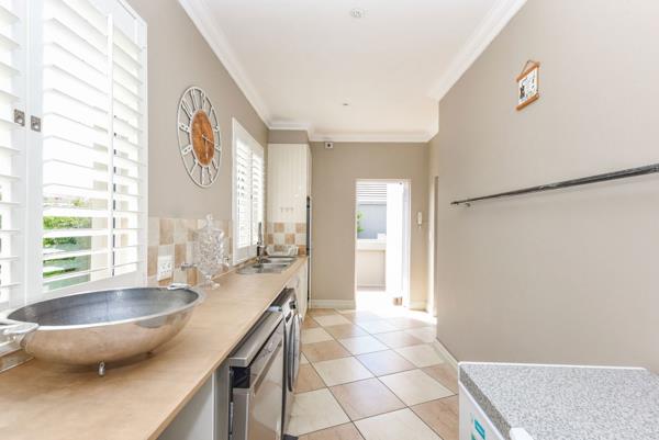Classic french gourmet kitchen with stone counter tops, a five plate gas hob and electric oven, space for a double door fridge, ample cupboards, and a large separate scullery with space for three appliances.