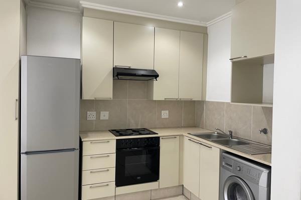 The kitchen offers space for a single door fridge and one appliance, broom cupboard and enough cupboard space.
