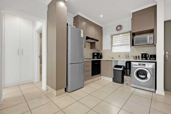The contemporary kitchen with its clean lines is perfectly suited to the apartment and is aesthetically appealing with stunning Caesarstone counter tops. It accommodates a fridge plus one appliance. The oven and hob run on electricity.