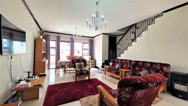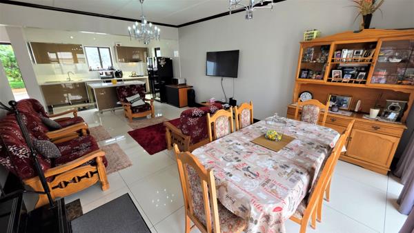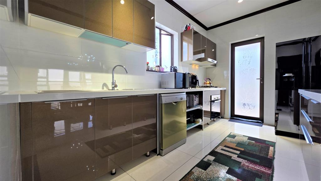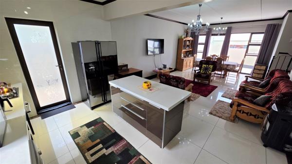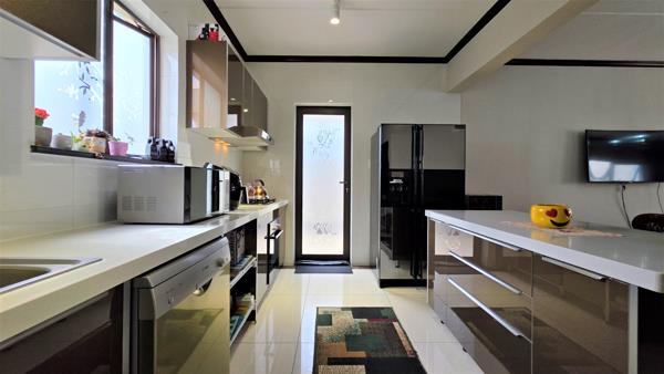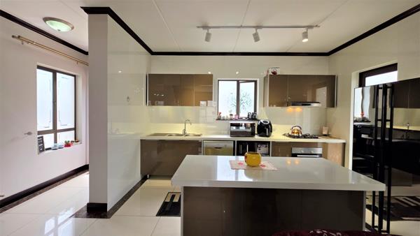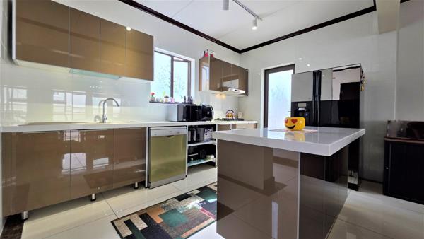 Nestled in a secure and prestigious upmarket estate, this stunning property offers a blend of modern luxury and practicality. Upon entering, you are greeted by a spacious open-plan living area, featuring a stylish lounge and dining room, with sleek white high-gloss floor tiles throughout, creating a bright and welcoming atmosphere. The contemporary kitchen is a chefs dream, boasting high-gloss cabinetry, quartz stone countertops, a gas hob with an extractor fan, and an oven. It also provides ample space for a double fridge and