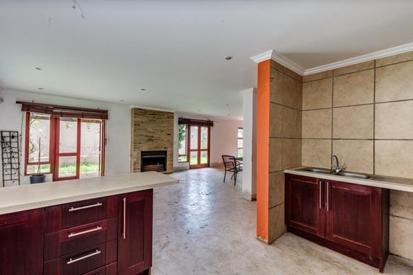 Enter into an open plan lounge and dining room, with a feature wood-burning fireplace. A covered entertainers patio, with a built-in braai, extends from the living areas, offering views of the wrap around garden. The kitchen is well-equipped, with granite counter tops.