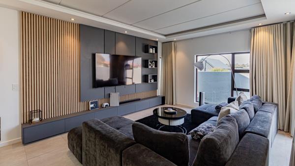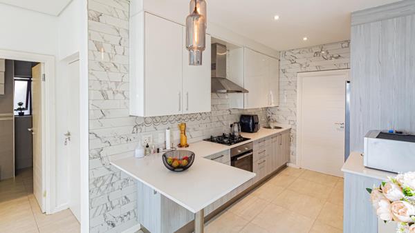 Step into the heart of the homea sleek, modern kitchen equipped with a gas stove, ample space for a double-door fridge, and a convenient scullery with room for both a dishwasher and washing machine. The expansive open-plan living area comfortably accommodates a 10-seater dining table, making it ideal for hosting gatherings. Adjacent to the dining space, the lounge features a built-in TV wall unit, ensuring a seamless entertainment experience.