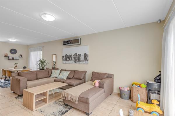 The living space flows seamlessly out to a covered patio, perfect for entertaining or relaxing, overlooking a large, easy-to-maintain garden thats ideal for kids, pets, or weekend braais.