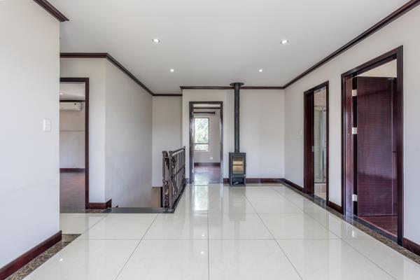 Upstairs, a cosy pyjama lounge with a fireplace creates the ideal relaxation space. Two guest bedrooms offer ample bespoke cupboard space, while the main bedroom features generous cupboards, a full en-suite bathroom, and its own private balcony. All bedrooms have an aircon.